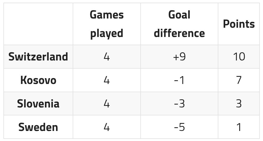 The defeat to Kosovo leaves Sweden rooted to the bottom of UEFA Group B with only one point from four games, six points behind second place (which ensures a play-off berth) with just two matches to play.