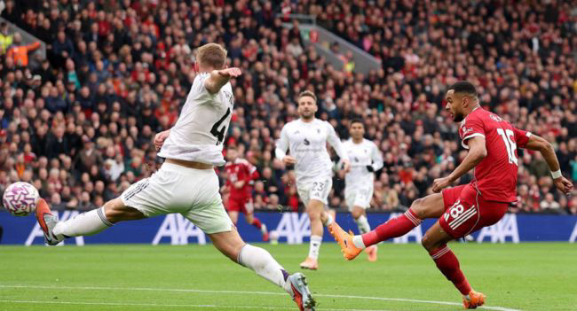 It happened in the blink of an eye — a curling free kick from Bruno Fernandes on the right wing, the ball slicing through the air, defenders rushing back. Cody Gakpo lunged to clear it… and in that fraction of a second, Anfield held its breath.