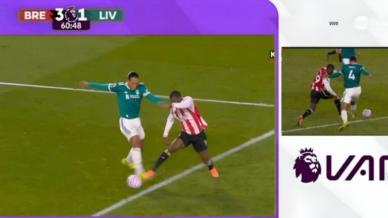 Midway through the second half, Virgil van Dijk challenged Dango Ouattara inside the box. The referee initially waved play on, but moments later, VAR stepped in, calling the referee to the pitch-side monitor.
