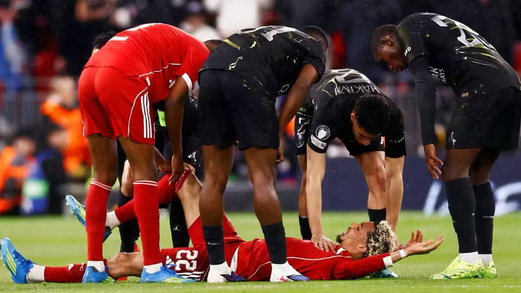 Hugo Ekitike looks set to miss the rest of the Premier League season and the 2026 World Cup after picking up a bad injury during Liverpool’s UEFA Champions League defeat to Paris Saint-Germain on Tuesday night. The Reds striker went down in a heap after around half an hour of the clash at Anfield, with no player near him. The Frenchman had turned, making a move to latch on to a Dominik Szoboszlai pass, but could not pick up the ball as he went down with what looked to be a bad injury. He pointed to his ankle, although it could have been an Achilles problem too, with the stretcher being called for and having to be stretchered off the field of play, to be replaced by Mohamed Salah. Liverpool Star Admits Ekitike Injury ‘Looks Bad’ Speaking after the game, teammate and countryman Ibrahima Konate said: “To be fair, I think it’s bad. I don’t know. I heard many things. “But I don’t want to talk about that because with the World Cup, all of the things coming this summer, it’s very, very hard for him at this moment. I send him my prayers and everything.” The 2026 World Cup will take place in the USA, Canada and Mexico this summer, with the tournament less than two months away from kicking off now. But Ekitike looks set to miss it, with some doctors delivering their verdict on the innocuous incident on social media. Renowned doctor and sports scientist Dr Rajpal Brar tweeted that he felt Ekitikewould be looking at at least seven months out of action, which would not only see him miss the rest of this season and the World Cup, but at least the first three months of the 2026/27 campaign too. Unfortunately, Ekitike's injury looks like the prototypical achilles rupture push off mechanism (see pic). Looking at 7-9 month return to sport for elite footballers, longer return to pre-injury levels.#lfc #championsleague pic.twitter.com/EZDNlbPAta— Dr. Rajpal Brar, DPT (@3cbPerformance) April 14, 2026 Brar was not the only one to suggest that timeframe for Ekitike to be on the sidelines. Football injury analyst @physioscout on X also weighed in by saying the same treatment time for the 23-year-old. He said: “Hugo Ekitike had to be stretchered off in Liverpool vs. PSG with an Achilles injury. Typical non-contact push-off mechanism during acceleration usually points towards an Achilles rupture. “Ekitike was also seen palpating his Achilles/calf complex after the incident. Expected Recovery Time: 7-9 months+ “Scans will be necessary to determine the extent of the injury. However, this one doesn’t look good.” Hugo Ekitike had to be stretchered off in Liverpool vs. PSG with an Achilles injury.Typical non-contact push-off mechanism during acceleration usually points towards an Achilles rupture. Ekitike was also seen palpating his Achilles/calf complex after the incident.Expected… pic.twitter.com/f3wZhAUtwd— Physio Scout | Football Injury Analysis (@physioscout) April 14, 2026 Post navigation VAR AUDIO LEAK SHOCKS EUROPEAN FOOTBALL BREAKING NEWS: “I Knew They’d Be Humiliated!” – Didier Drogba Blasts “Unfit” Alexander Isak After Liverpool’s Champions League Disaster.